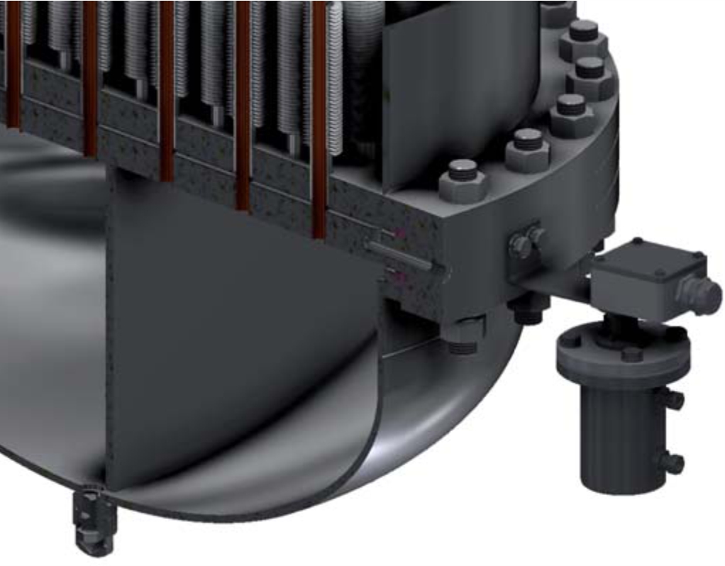 При возникновении коррозии со стороны одной из труб среда по канавкам стекает в контрольную полость между трубными решетками, что приводит к срабатыванию индикатора утечки ALC и подаче соответствующего сигнала.