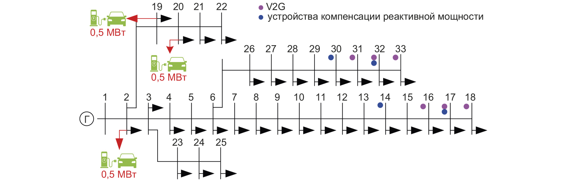 В работе предложен оптимизационный метод, предназначенный для планирования размещения быстрых зарядных станций, точек обратной передачи электроэнергии в сеть (V2G), а также устройств компенсации реактивной мощности (УКРМ). Целью разработанного подхода является повышение эффективности работы распределительной электрической сети за счет оптимизации уровня напряжения и снижения потерь электроэнергии с учетом затрат на установку УКРМ. Задача сформулирована в виде целевой функции с учетом технических и эксплуатационных ограничений. Для ее решения применяется модифицированный генетический алгоритм, адаптированный к особенностям рассматриваемой задачи. Эффективность подхода продемонстрирована на примере различных сценариев, реализованных на тестовой 33-узловой схеме IEEE.