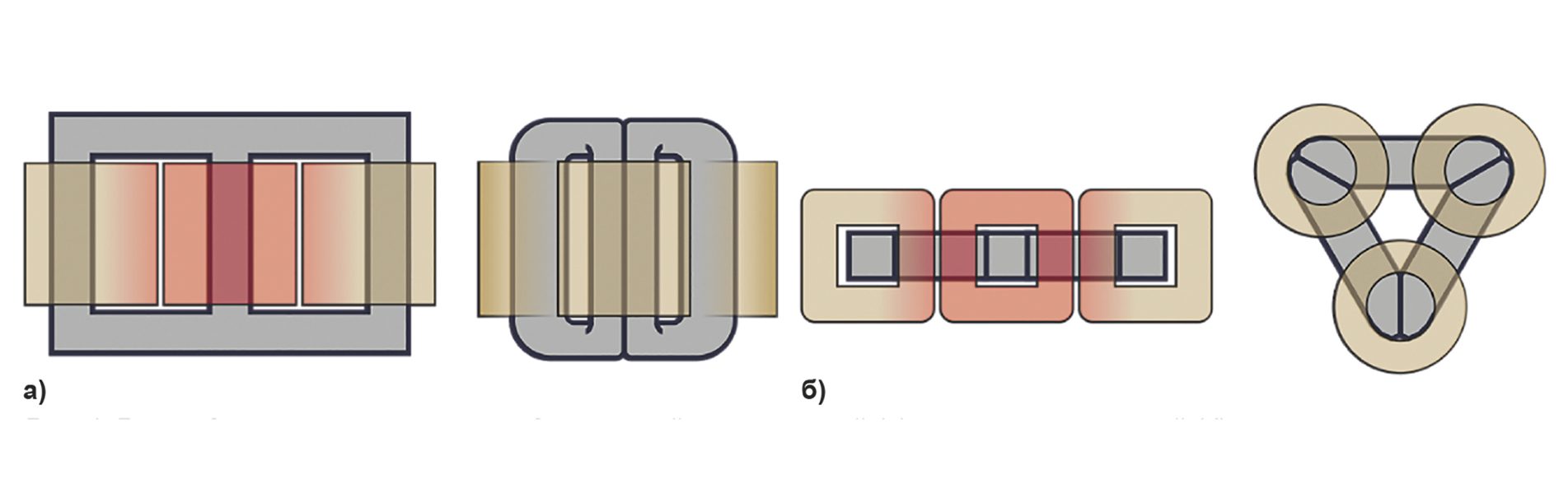 Отличительная особенность наших трансформаторов — пространственная конструкция (рисунок 2). Она была выбрана не случайно — применение данной магнитной системы позволяет уменьшить массу активной стали до 7% и потери холостого хода до 10% при существенном (в 2–3 раза) уменьшении тока холостого хода по сравнению с плоской шихтованной системой. На практике благодаря применению пространственного сердечника из аморфной стали удалось снизить массу магнитопровода на 20–25% и получить потери, превосходящие уровень потерь ХХ и КЗ по сравнению с классом энергоэффективности Х4К3 по СТО 34.01–3.2–011–2021 «Трансформаторы силовые распределительные 6–10 кВ мощностью 63–2500 кВА. Требования к уровню потерь холостого хода и короткого замыкания».