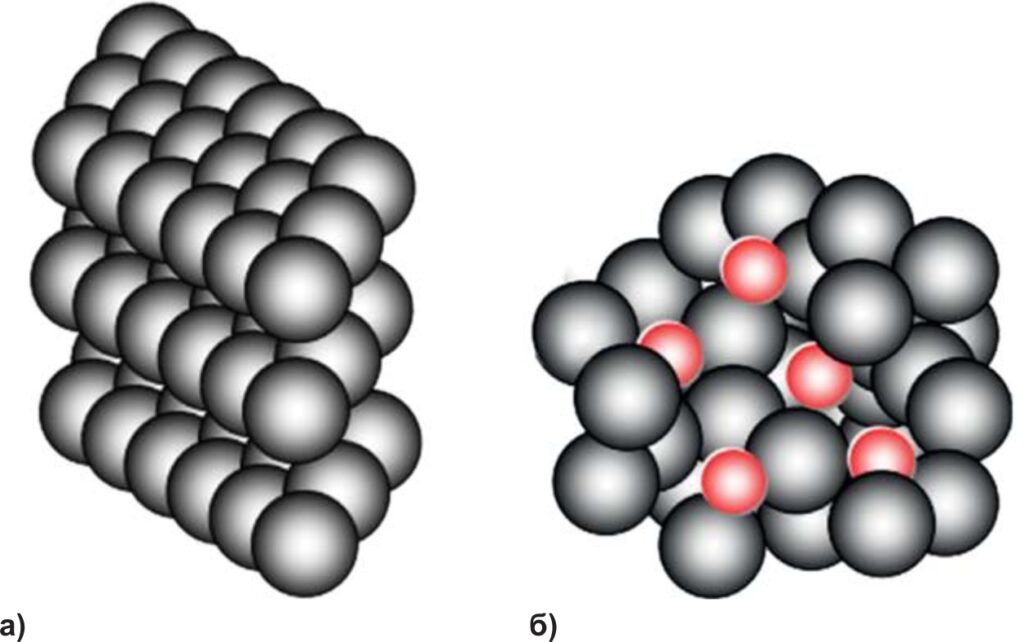 Аморфная сталь обладает структурой, в которой отсутствует кристаллическая решетка (рисунок 1б). Изготавливается она методом спиннингования расплава, иными словами, когда струя расплавленного сплава под избыточным давлением газа подается через отверстие на поверхность вращающегося с большой скоростью охлаждаемого барабана.