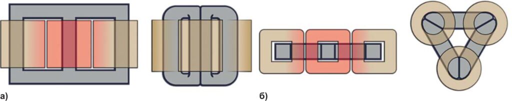Также неоспоримым преимуществом применения пространственной магнитной системы является магнитная симметрия. За счет равномерного распределения магнитного поля по стержням магнитопровода (рисунок 3) обуславливается и симметричный режим работы обмоток во всех режимах работы.