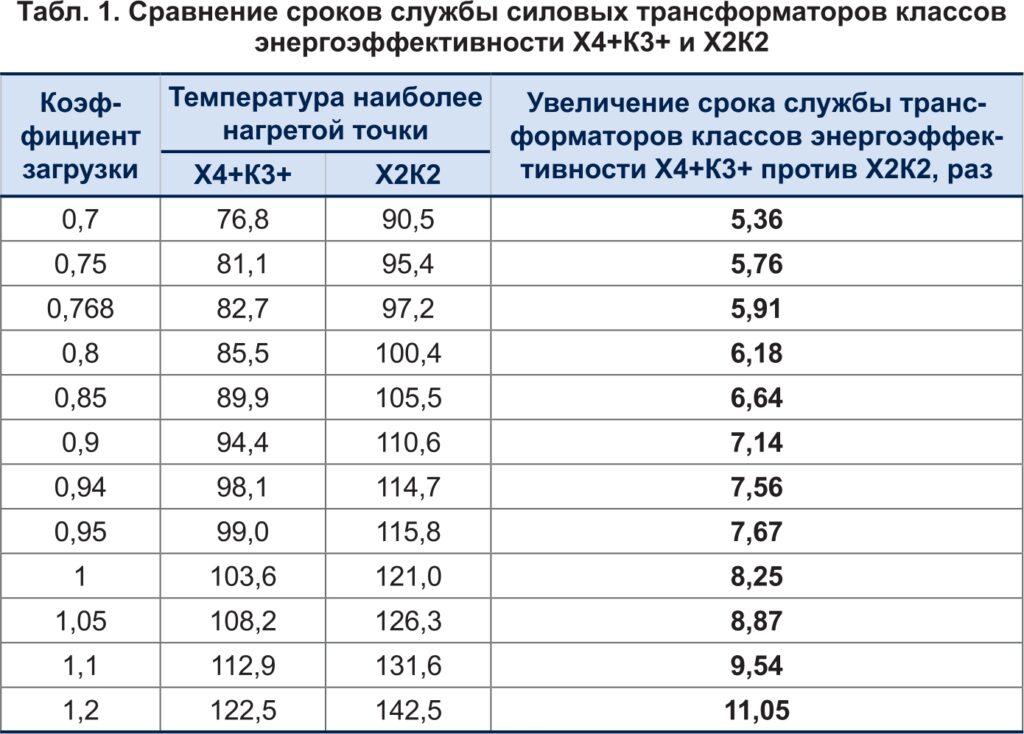 По методике, описанной в ГОСТ 14209–85, были рассчитаны основные показатели и произведено сравнение теоретических значений сроков службы силовых трансформаторов классов энергоэффективности Х4+К3+ и Х2К2, то есть инновационных, разрабатываемых и изготавливаемых ООО «НПК «АВТОПРИБОР» и внедряемых повсеместно в настоящее время. Результаты расчета температур ННТ для трансформаторов разных классов энергоэффективности и отношения сроков службы данных трансформаторов приведены в таблице 1. На рисунках 7 и 8 проиллюстрированы полученные зависимости от коэффициента загрузки.