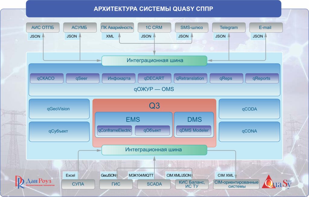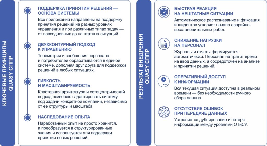 QuaSy СППР — двухконтурная система с элементами искусственного интеллекта. Первый контур предназначен для мониторинга телеметрии, второй — для анализа текстовых сообщений. Кросс-контурные приложения включают классификаторы и репозитарии для ведения цифровой модели сети в соответствии со стандартами CIM IEC 61970/61968 и серией ГОСТ Р 58651.