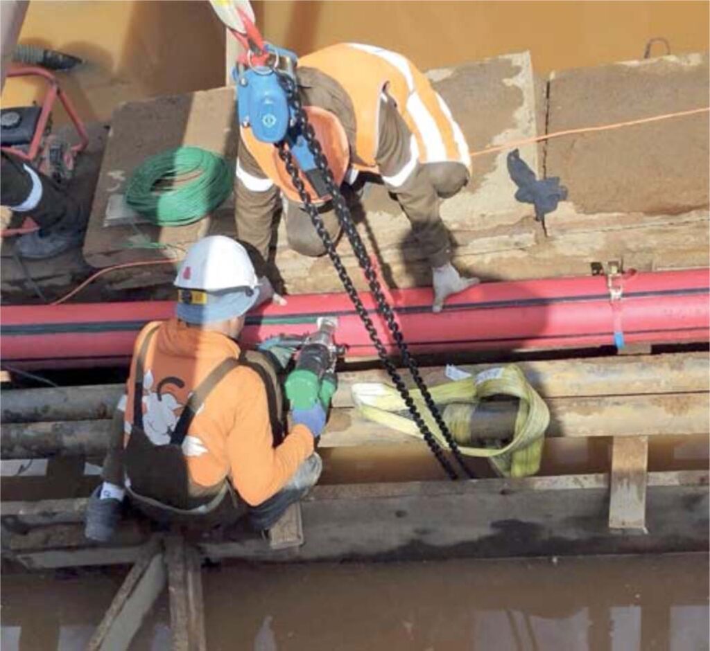 Способ предполагает использование гладкостенных труб, как правило, такого же типа и диаметра, как было применено на рассматриваемой КЛ на ее неповрежденных участках (рисунок 4). Отрезок ремонтной трубы разрезается вдоль и накрывает с двух сторон требующий защиты участок кабеля. При этом две части разрезанной трубы соединяются между собой с помощью продольной сварки ручным экструдером (рисунок 5). Сваренные продольно трубы должны быть замоноличены бетоном вокруг, чтобы придать данной конструкции необходимую кольцевую жесткость, способность сопротивляться давлению грунта и транспортной нагрузке. Данный способ защиты является наиболее надежным из всех ранее перечисленных способов защиты, однако из-за существенной трудоемкости и длительности выполнения работ является крайне дорогостоящим, превосходя по стоимости защиту монолитными трубами более чем в 3–4 раза.