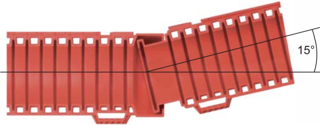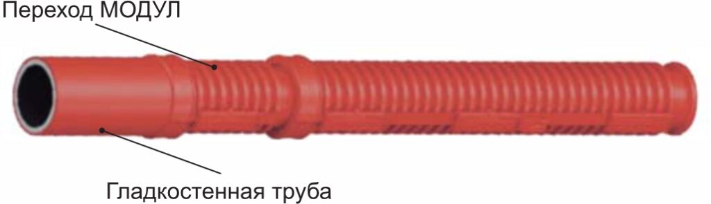 Соединение МОДУЛ с гладкостенными трубами выполняется с использованием так называемых переходов (рисунок 8). Повороты трубного канала выполняются в местах раструбного соединения труб между собой (рисунок 9) с максимальным углом поворота в одном соединении 15°. При необходимости организации поворота малого радиуса изгиба надо использовать набор из коротких доборов.