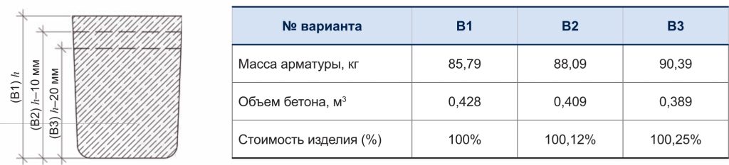 В то же время был проведен анализ возможности снижения массы конечного изделия за счет изменения объема бетона путем снижения высоты его заливки (рисунок 1). Изменение существующей формы стойки СВ в части уменьшения ее высоты не снижает ее конечной стоимости (за счет увеличения массы арматуры), но может позволить снизить массу бетона и, как следствие, готового изделия до 10% (порядка 100 кг). При этом следует отметить, что изменение формы сечения стойки за счет изменения высоты заливки бетона потребует корректировки технологии заливки либо изменения конструкции существующих форм (уменьшение высоты) у заводов — производителей железобетонной продукции, что, в свою очередь, может повлечь корректировку конструкций хомутов для крепления траверс, узлов крепления подкосов, навесного оборудования и др. С учетом указанного, в рамках проведения НИОКР было принято решение о сохранении существующей формы для изготовления стоек типа СВд.
