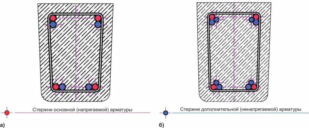 С учетом указанного выше, при разработке опытных образцов стоек типа СВ на основании разработанной КД было принято решение отказаться от наиболее эффективного в части соотношения вес/стоимость решения на базе арматуры А1000. Опытные образцы стоек типа СВ были изготовлены по КД с использованием вариантов № 3 для СВ 95–3,5д, № 2 для СВ 110–5д и № 3 для СВ 110–7д (таблица 2) с комбинированным сочетанием напряженных и ненапряженных стержней со схемой их расположения согласно рисунку 2.