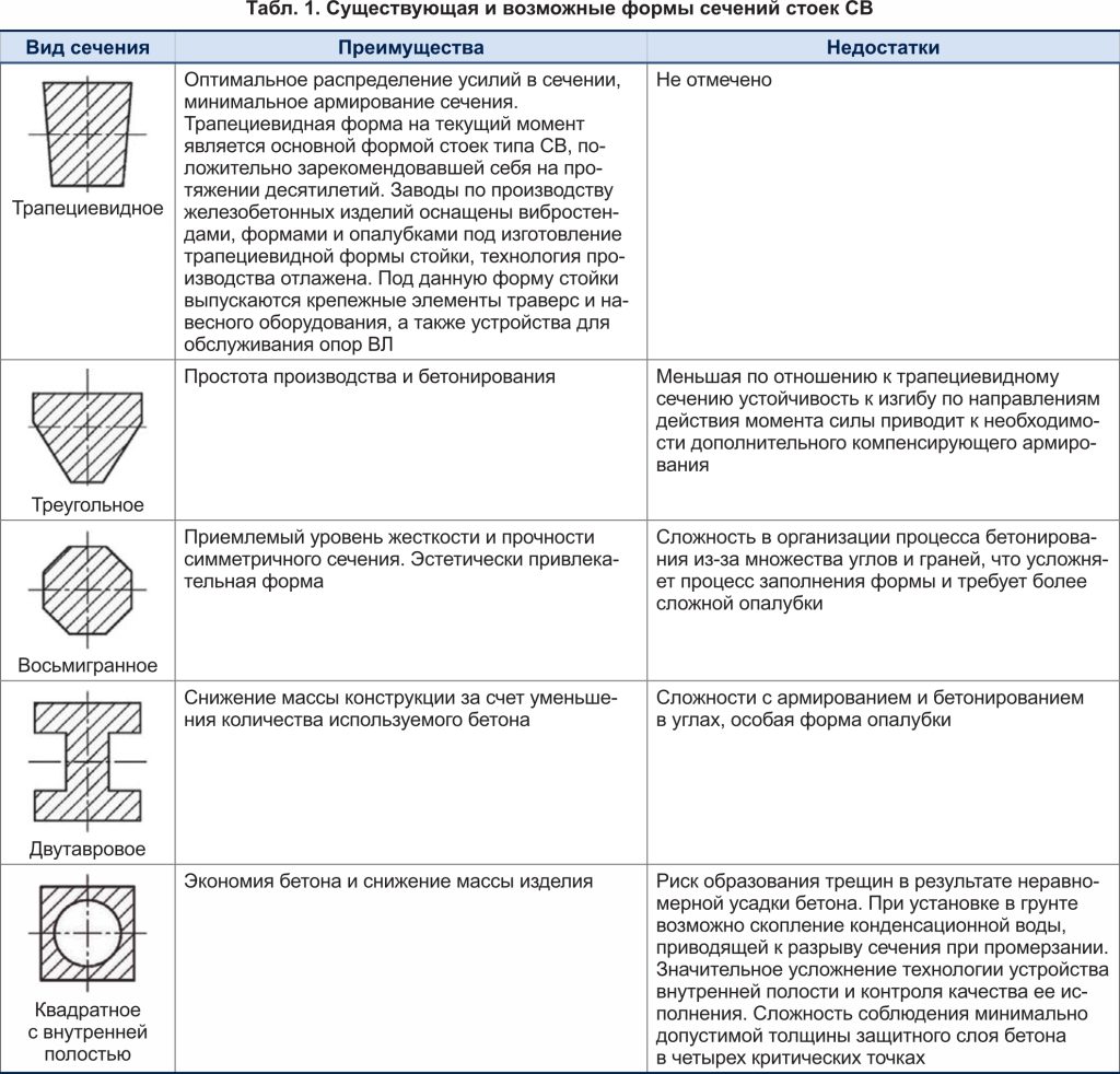 В рамках реализации НИОКР был проведен анализ возможности изменения геометрии стоек типа СВ. В таблице 1 приведены основные рассмотренные сечения стоек типа СВ с указанием их преимуществ и недостатков.