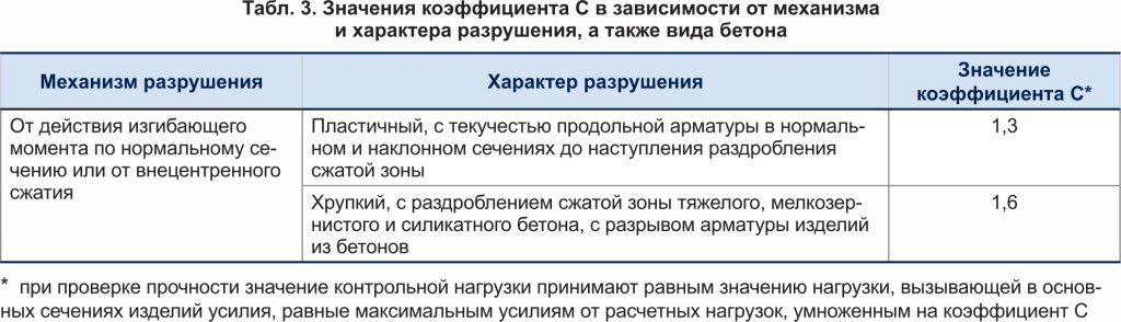 В целях определения механической прочности полученных при выполнении НИОКР изделий были разработаны программа и методика испытаний опытных образцов стоек, учитывающие необходимость испытания железобетонных конструкций в соответствии с требованиями [4] (Приложение Б), согласно которым регламентируются значения контрольных нагрузок коэффициента С (таблица 3).