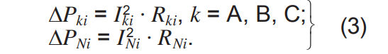 где ΔPki, ΔPNi — потери активной мощности в фазе k и в нулевом проводе на i-м элементе, рассчитывающиеся по формулам: