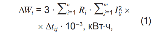 где n — число элементов сети; Δtij— интервал времени, в течение которого токовую нагрузку Iij i-го элемента сети с сопротивлением Ri принимают неизменной (в текущих расчетах — 1 час); m — число интервалов времени.
