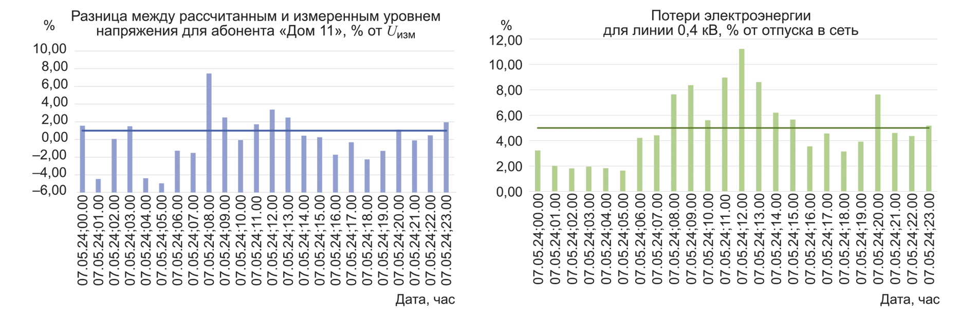 где ΔUдопустимое — заданное граничное значение разницы напряжений, вводится пользователем, %; Uизм i, Uрасч i — измеренное ИУ и рассчитанное Модулем значение напряжения в узле за i-й час.