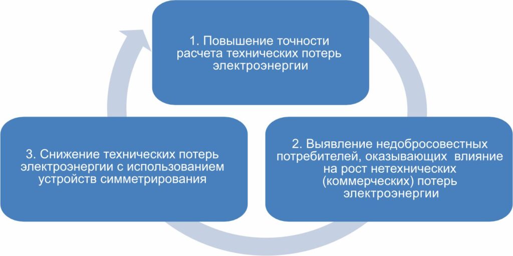 Несимметричная нагрузка однофазных потребителей электроэнергии 0,4 кВ существенно влияет на значение технических потерь электроэнергии. Для корректного расчета технических потерь в целях разработки мероприятий по их снижению необходимо повышать информационную обеспеченность данных расчетов. Эти же факторы влияют и на точность определения нетехнических (коммерческих) потерь. Постоянно увеличивающийся автоматизированный парк интеллектуального учета электроэнергии позволяет эту задачу решить, тем самым существенно увеличить точность результатов, а также обеспечить поиск абонентов, оказывающих влияние на рост нетехнических (коммерческих) потерь электроэнергии.