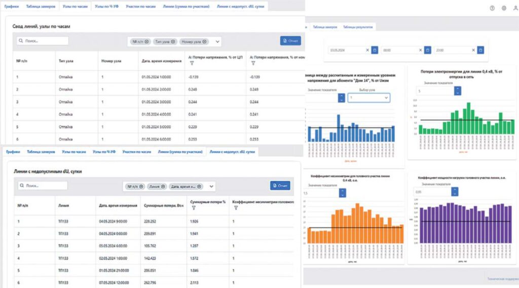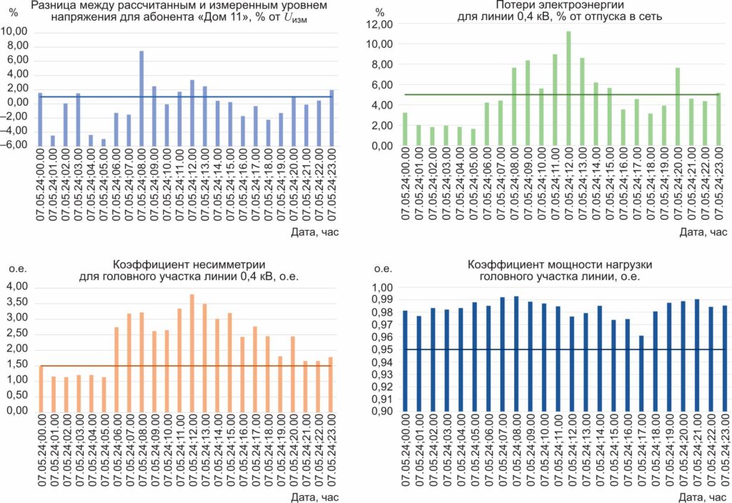 С использованием функции загрузки данных (таблица замеров) результаты измерения с приборов интеллектуального учета (часовые значения нагрузок потребителей и уровни напряжения в узлах с нагрузкой) и исходные данные внесены в базу данных Модуля и выполнены расчеты. Результаты расчетов в виде информационных графиков для одних суток представлены на рисунке 4.
