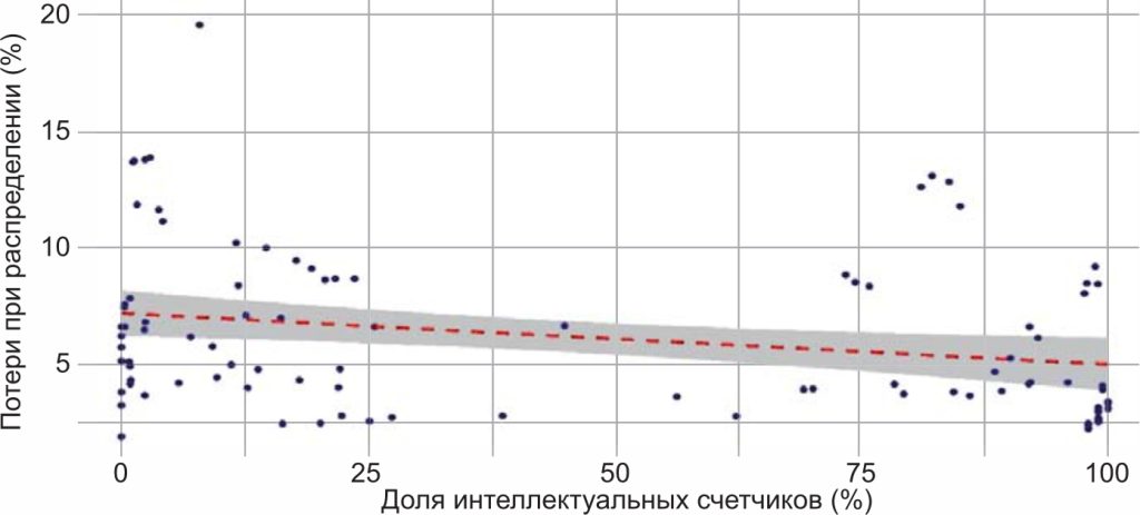 На рисунке 5 [5] показана взаимосвязь между долей интеллектуальных приборов учета и относительными потерями электроэнергии в распределительных сетях. Из рисунка видно, что существуют значительные диапазоны относительных потерь в сетях различных стран при одних и тех же долях интеллектуального учета. Тем не менее, имеется устойчивый тренд на снижение потерь при росте этой доли. Этот тренд подтверждается и отечественным опытом внедрения ИСУЭ в отдельных регионах России.