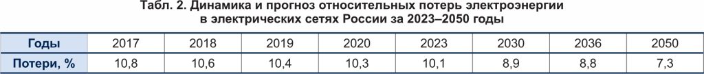 Динамика и прогноз относительных потерь электроэнергии в электрических сетях России за 2023–2050 годы представлены в таблице 2 [4].