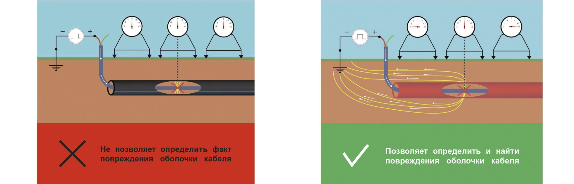 Для испытаний и поиска повреждений оболочки важно, чтобы испытательный ток IИ смог выйти с экрана через поврежденную оболочку в грунт. К сожалению, если место повреждения оболочки пришлось на трубный участок, то обычные полимерные трубы изолируют кабель от грунта, исключая прохождение тока IИ (рисунок 5а). Таким образом, в ходе данных испытаний даже кабель с серьезными повреждениями наружной оболочки будет ошибочно признан полностью исправным, будет разрешена его дальнейшая эксплуатация, в ходе которой вода, имеющаяся в трубе, продолжит постепенно проникать внутрь СПЭ-изоляции, доведя ее до КЗ.