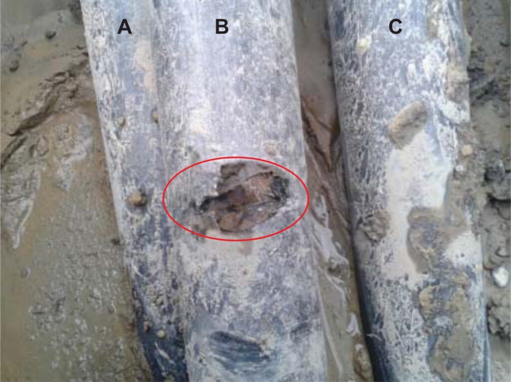 Согласно опыту эксплуатации уже через 5–7 лет работы кабеля с поврежденной оболочкой проникновение воды в СПЭ-изоляцию приводит к ее КЗ. Таким образом, повреждение наружной оболочки кабеля — это существенный дефект, который пусть не быстро, но неизменно приведет к увлажнению СПЭ-изоляции и ее КЗ, требующему длительного дорогостоящего ремонта КЛ.