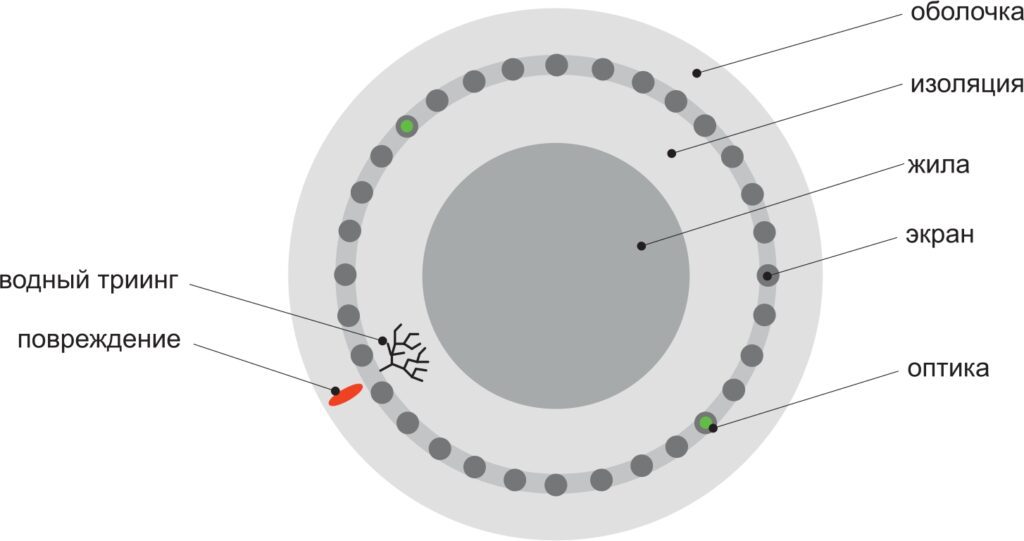 Таким образом, повреждение оболочки кабеля не может быть зафиксировано ни за счет контроля ЧР кабеля, ни за счет температурного мониторинга.