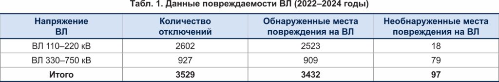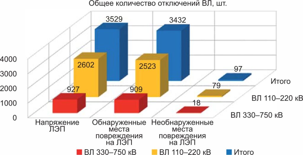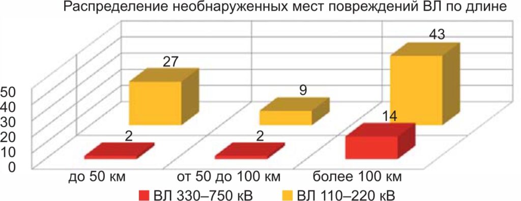 В 97% аварийных отключений место повреждения было обнаружено, а в 3% — нет. На ВЛ 110– 220 кВ место повреждения было обнаружено в 97% случаев, а на ВЛ 330–750 кВ — в 98% случаев.