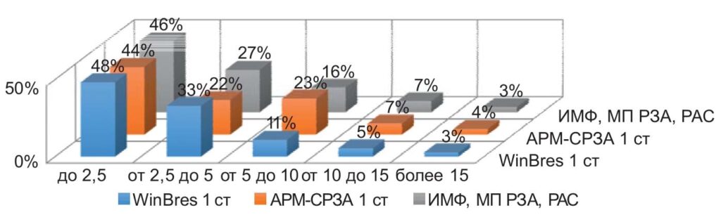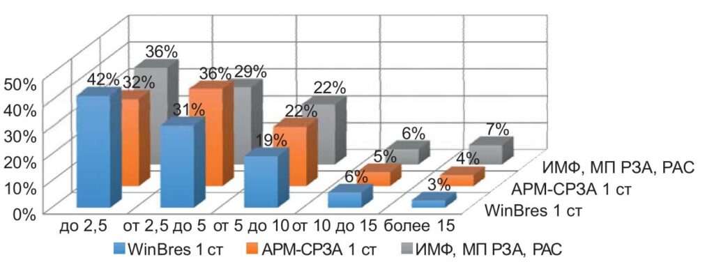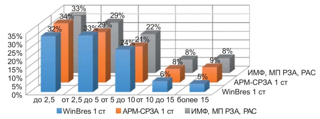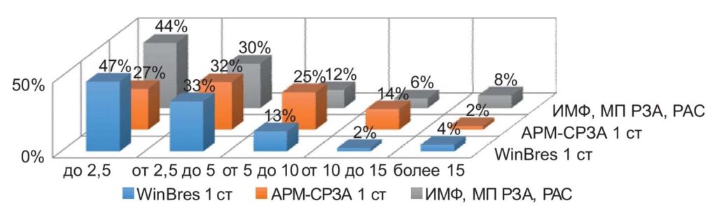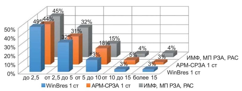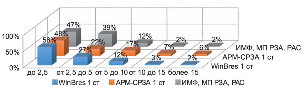 Для оценки точности ОМП использовалось распределение общего числа зарегистрированных результатов ОМП по четырем группам погрешностей — соответственно менее 2%, от 2% до 5%, от 5% до 10% и более 10% от длины ВЛ. При этом все ВЛ были классифицированы не только по уровням напряжения (110–220 кВ и 330– 750 кВ), но также и по длине ВЛ.