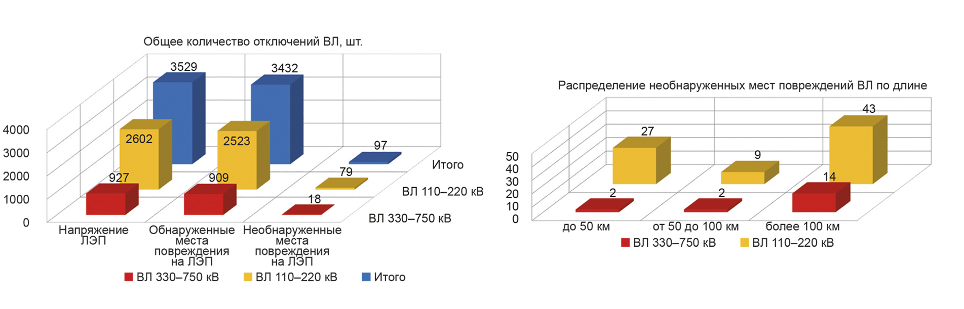 В 97% аварийных отключений место повреждения было обнаружено, а в 3% — нет. На ВЛ 110– 220 кВ место повреждения было обнаружено в 97% случаев, а на ВЛ 330–750 кВ — в 98% случаев.