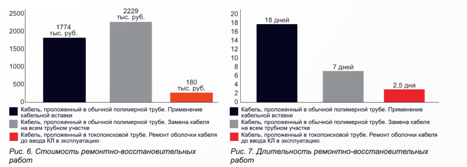 По причине того, что обычные полимерные трубы не позволяют обнаружить повреждение оболочки кабеля до ввода линии в эксплуатацию, ремонтно-восстановительные работы в этом случае будут проводиться спустя несколько лет работы КЛ, когда через повреждение оболочки в изоляцию проникнет влага и приведет к пробою кабеля. В этой связи ремонт будет проводиться путем установки кабельной вставки или замены кабеля на всем трубном участке (черный и серый столбцы на рисунках 6 и 7).