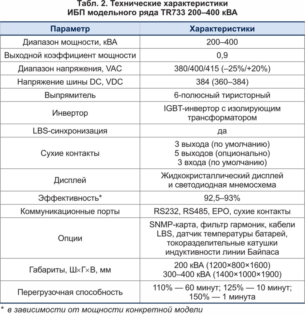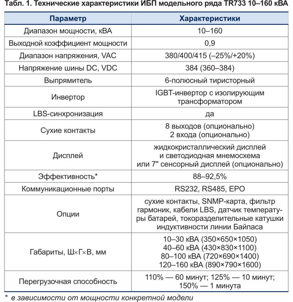 Модели TR733 10–160 кВА и TR733 200–400 кВА отличаются не только диапазоном мощности, но также массогабаритными характеристиками и количеством сухих контактов. Кроме того, для TR733 10–160 кВА предусмотрена опциональная возможность установки семидюймового сенсорного дисплея. Технические характеристики ИБП модельного ряда TR733 10–160 кВА и TR733 200–400 кВА представлены в таблицах 1 и 2.