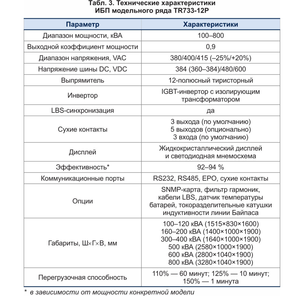 Отличительная особенность модели TR733–12P — высококачественный 12–пульсный выпрямитель, который позволяет значительно снизить пульсации в составе выходного напряжения, уменьшить теплопотери на тиристорах и повысить КПД всего ИБП. Технические характеристики ИБП модельного ряда TR733-12P представлены в таблице 3.
