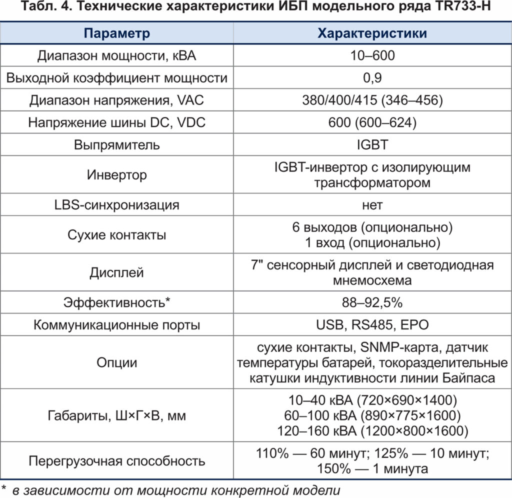Модель TR733–H, помимо диапазона мощности, выделяет высококачественный выпрямитель, основанный на IGBT-технологии. Кроме того, устройства оснащаются сенсорным семидюймовым дисплеем с интуитивно понятной панелью оператора, отображающей рабочие параметры, настройки и записи журнала. Технические характеристики ИБП модельного ряда TR733–H представлены в таблице 4.