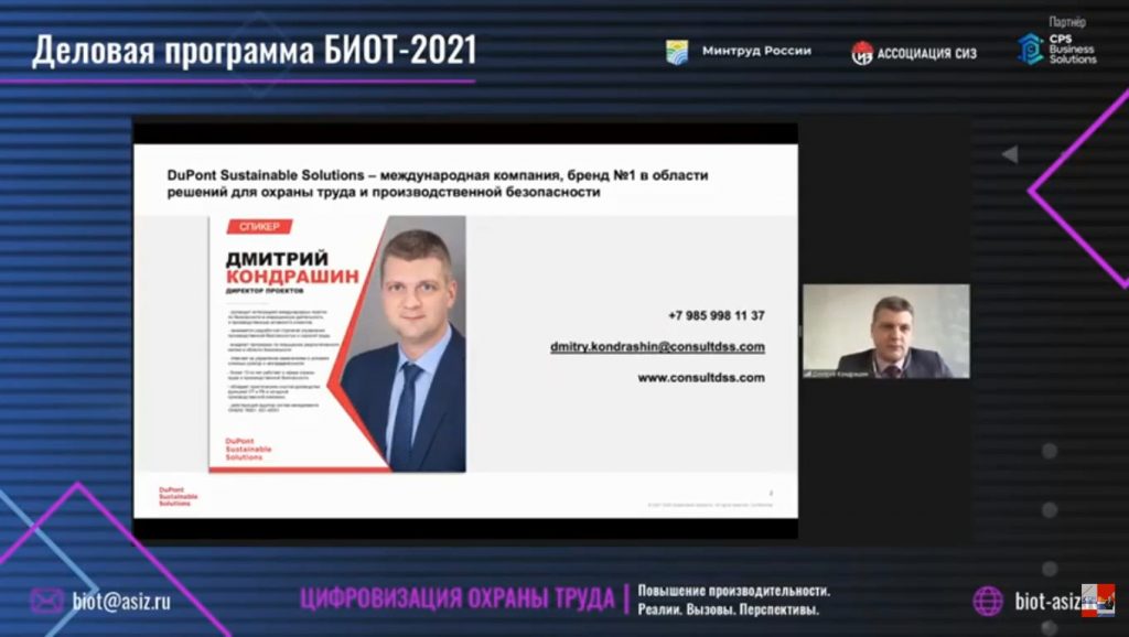 Продолжило конференцию выступление директора проектов компании DuPont Sustainable Solutions по РФ и странам СНГ Дмитрия Кондрашина. Дмитрий Николаевич в своей презентации дал оценку готовности отечественных компаний к использованию цифровых решений для повышения безопасности труда. Цифровизацию Дмитрий Кондрашин назвал логичным продолжением развития культуры безопасности на производственных предприятиях. А также обозначил данный вопрос как один из самых актуальных в современной промышленности.