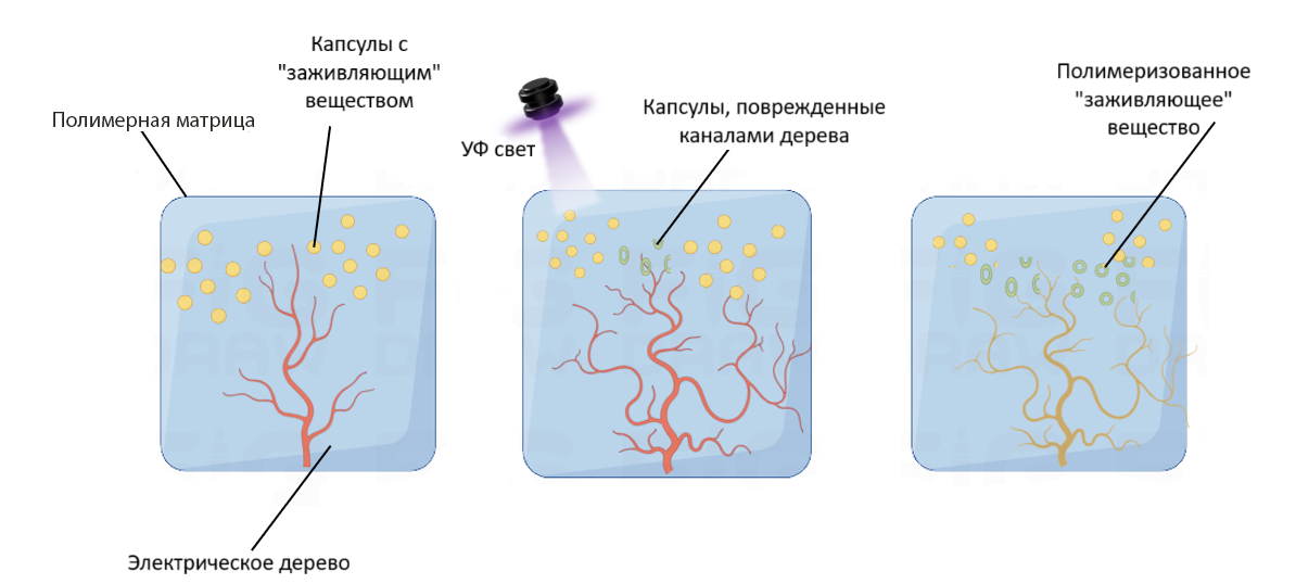 Одним из таких материалов стала разработанная китайскими исследователями интеллектуальная изоляция с активируемой ультрафиолетовым излучением «заживляющим» эффектом и визуализацией повреждений. В ней используются микрокапсулы, высвобождающие «заживляющее» вещество. Активация микрокапсул производится при повреждении электрическим током или при появлении трещины в капсуле в результате механического разрушающего воздействия.