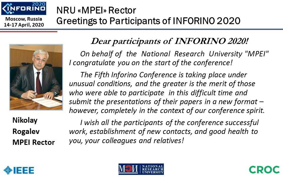 В связи с пандемией коронавируса, а также в соответствии с рекомендациями ВОЗ, IEEE, нормативными документами Министерства науки и высшего образования России и властей г. Москвы конференция ИНФОРИНО-2020 проводилась с использованием дистанционных технологий – всеми участниками были представлены видеопрезентации своих докладов, а пленарное заседание проходило в форме видео-конференции.