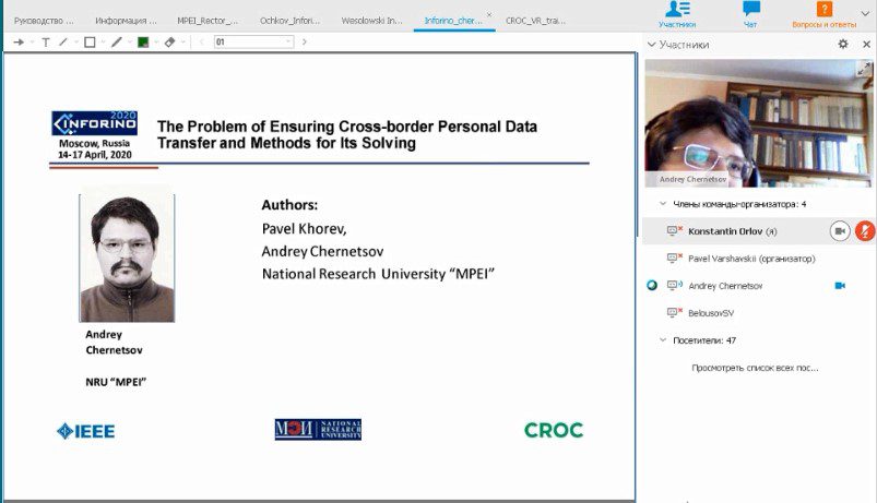Андрей Михайлович Чернецов, доцент кафедры ПМИИ Института информационных и вычислительных технологий НИУ «МЭИ» в докладе «The Problem of Ensuring Cross-Border Personal Data Transfer and Methods for its Solving» обратил внимание на проблемы безопасности трансграничной передачи персональных данных.