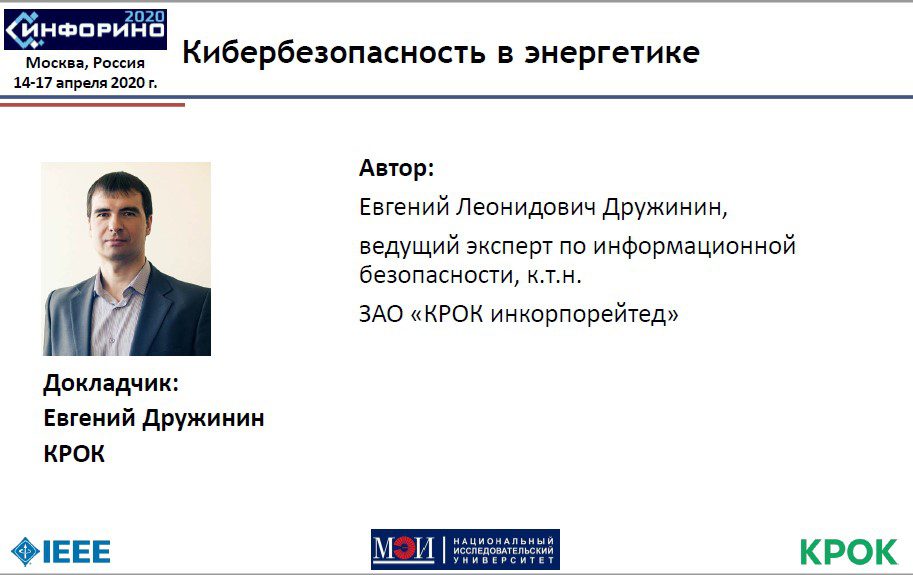 Завершил пленарную часть конференции доклад Евгения Леонидовича Дружинина, эксперта Департамента информационных технологий компании КРОК, посвященный кибербезопасности в энергетике.