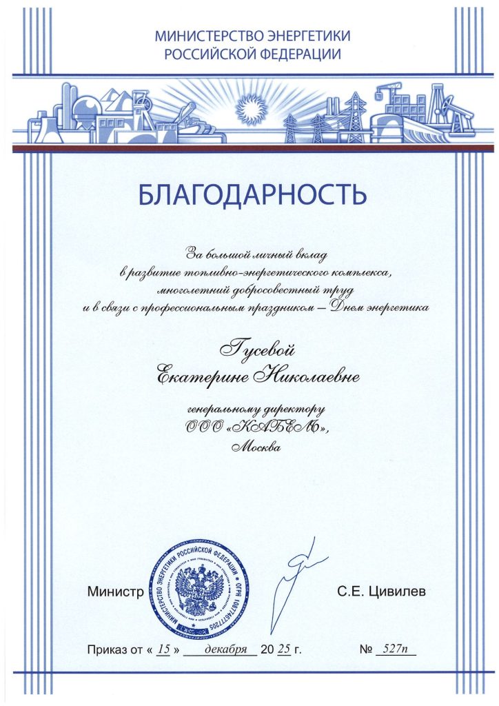 Личного благодарственного адреса удостоена и генеральный директор издательства журнала «ЭЛЕКТРОЭНЕРГИЯ. Передача и распределение» (учредитель — ООО «Кабель») Екатерина Гусева (приказ Минэнерго России № 527п от 15 декабря 2025 года) с формулировкой: «За большой личный вклад в развитие топливно-энергетического комплекса, многолетний добросовестный труд и в связи с профессиональным праздником — Днем энергетика».