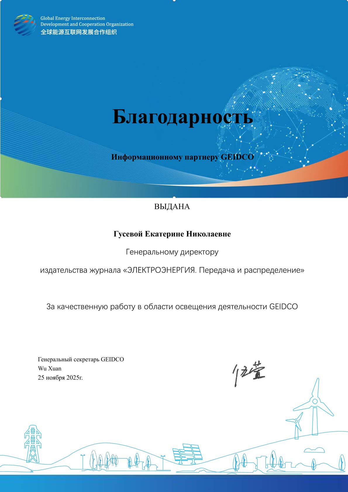 Заместитель Председателя Правления АО «СО ЕЭС», член редсовета журнала:Поздравительное письмо