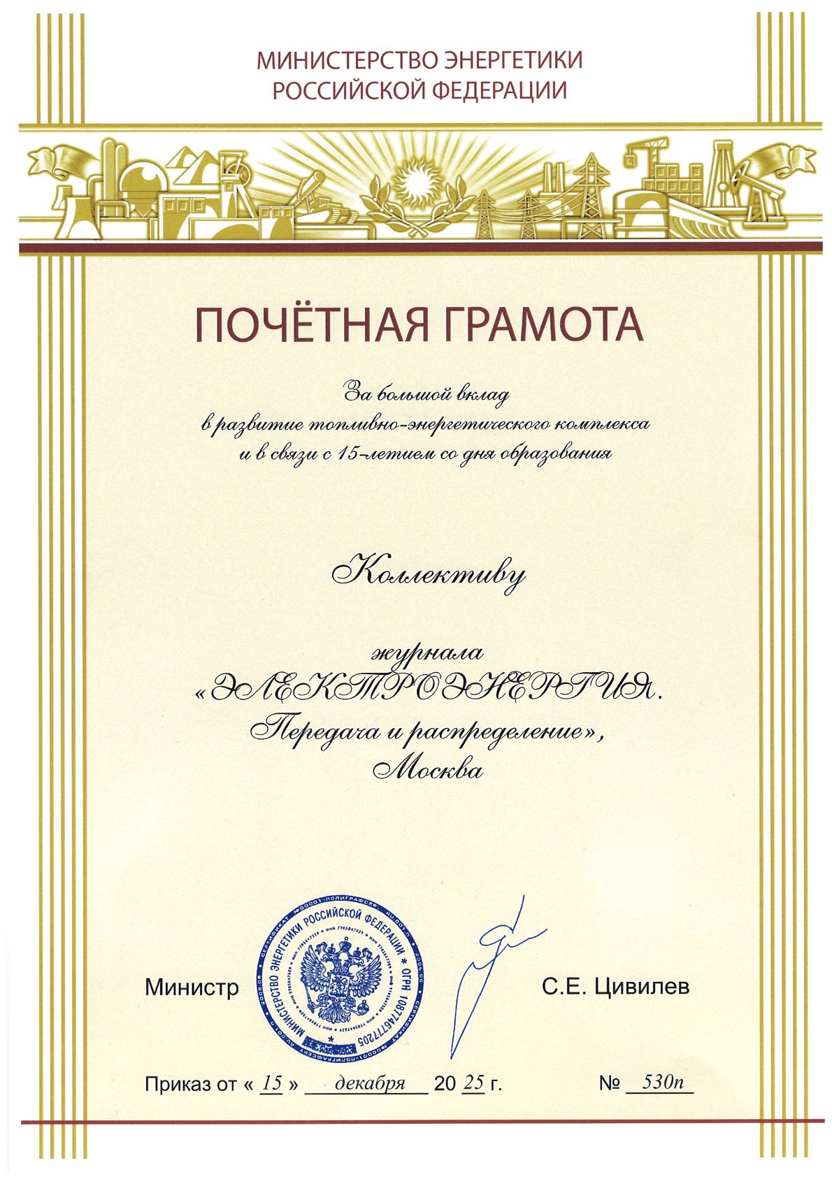 От имени Министерства энергетики Российской Федерации примите самые искренние поздравления с десятилетним юбилеем журнала «ЭЛЕКТРОЭНЕРГИЯ. Передача и распределение»! Сегодня издание по праву занимает одно из ведущих мест в медиапространстве электроэнергетики России. Ваше внимательное отношение к самым важным вопросам функционирования и развития энергетики, профессиональный подход к изложению материала, обширные деловые связи, в том числе с такими международными профессиональными организациями, как CIGRE, CIRED, GEIDCO, а также получение научного статуса и включение журнала в перечень ВАК формируют сбалансированную информационную среду, привлекающую широкое сообщество профессионалов отрасли. Все это представляет большую ценность для организации процесса обучения персонала энергокомпаний, повышения его квалификации в целях обеспечения устойчивого и безаварийного функционирования энергосистемы в условиях цифровой трансформации. Желаю издательству журнала «ЭЛЕКТРОЭНЕРГИЯ. Передача и распределение» новых успехов в работе, постоянного расширения и совершенствования информационного контента в соответствии с запросами профессионального сообщества. Выражаю особую благодарность руководителю издательства Гусевой Екатерине Николаевне, всем сотрудникам редакции журнала, членам редакционного совета и редакционной коллегии за проделанную работу.